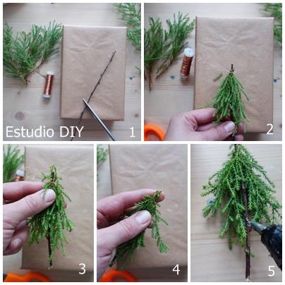 Finalmente, solo nos queda pegar nuestro arbolito al envoltorio del regalo. Podemos ayudarnos de cuerda, cintas o detalles que tengamos por casa para completar el look.3.- Corona.