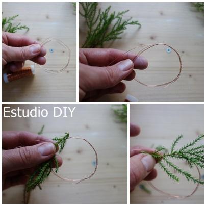 Una vez que tenemos formado nuestro pequeño aro metalizado, enrollamos el cabo del extremo cortado, sobre el mismo (como se aprecia en la imagen). El otro extremo nos servirá para envolver y sujetar las ramitas de ciprés.Paso nº 3
