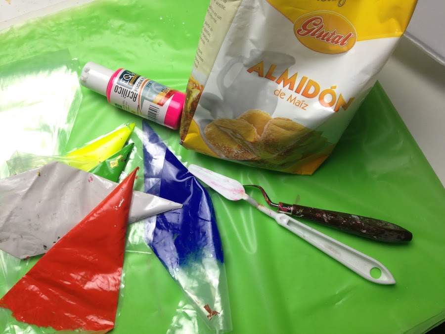 Colocar la pintura acrílica que se necesita espesar en una bandeja descartable y agregarle la fécula de maíz e ir incorporándola de a poco sin miedo a que se formen grumos.