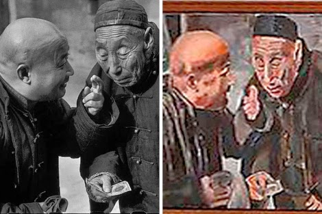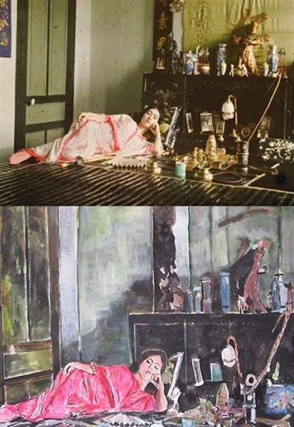 La fotografía de Cartier-Breeson (i.) y la pintura de Bob Dylan (d.). Arriba: "Mujer fumando opio" de Busy.