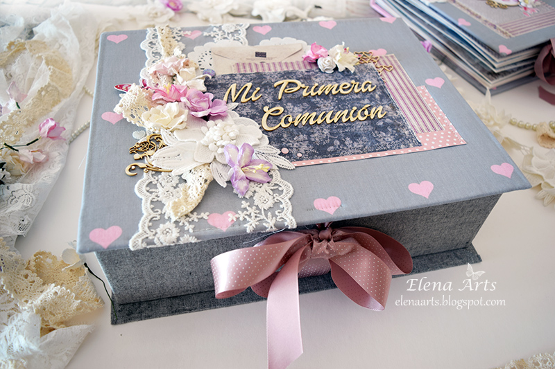 Una caja a juego, al mismo estilo y colores. Las tapas están acolchadas, tanto las del álbum, como las de la caja. La tela gris con corazones rosas es muy romántica y las flores lo acentúan aún más.