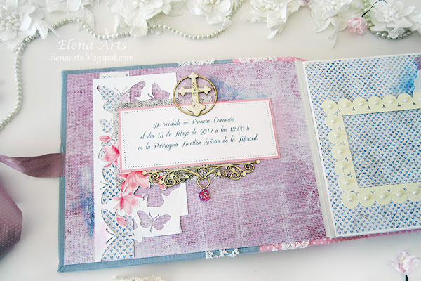 la parte de atrás no la decoré, porque aquí se pondrá una foto de los chicos que hacen la comunión junto a alba, el mismo día. Como todavía no se sabía la foto cómo iba, pues la decidimos dejar sin nada. y la siguiente página la dejamos en blanco, será donde los mismos chicos dejen un mensaje a Alba.