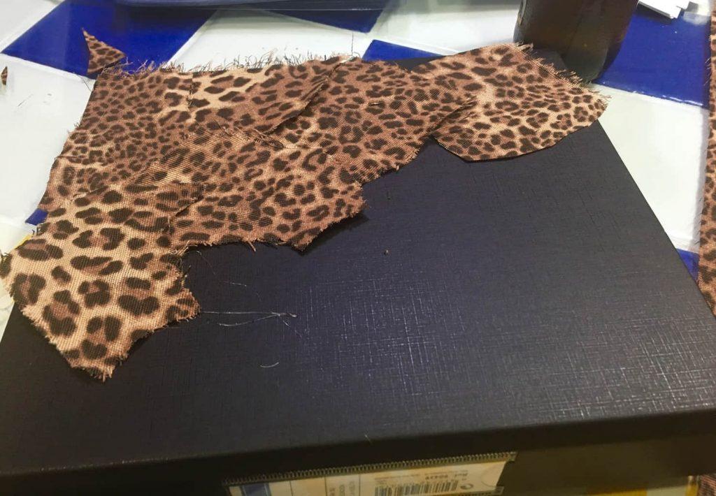 Se me ocurrió, ya que se trata de reciclar y aprovechar al máximo todo para no desperdiciar nada, hacer trocitos pequeños de tela deshilachados y después poner unos al lado de otros, sobreponiendo los cantos, para tapar por completo el negro de las tapas.