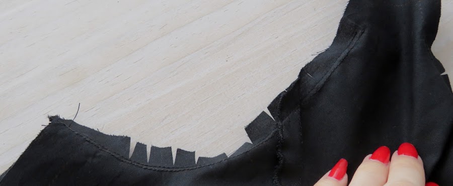En este caso, no he realizado esos pequeños cortes que te mostré antes, ya que es un escote lineal, pero si los hice en la esquinita que ves, ya que no es del todo lineal, sino con forma curva