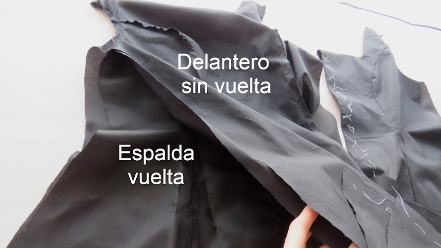 Pieza 2: Estaríamos viendo el revés de la espalda del forro o vista (por lo que el derecho de esta pieza está viendo al derecho del delantero, pieza 1)