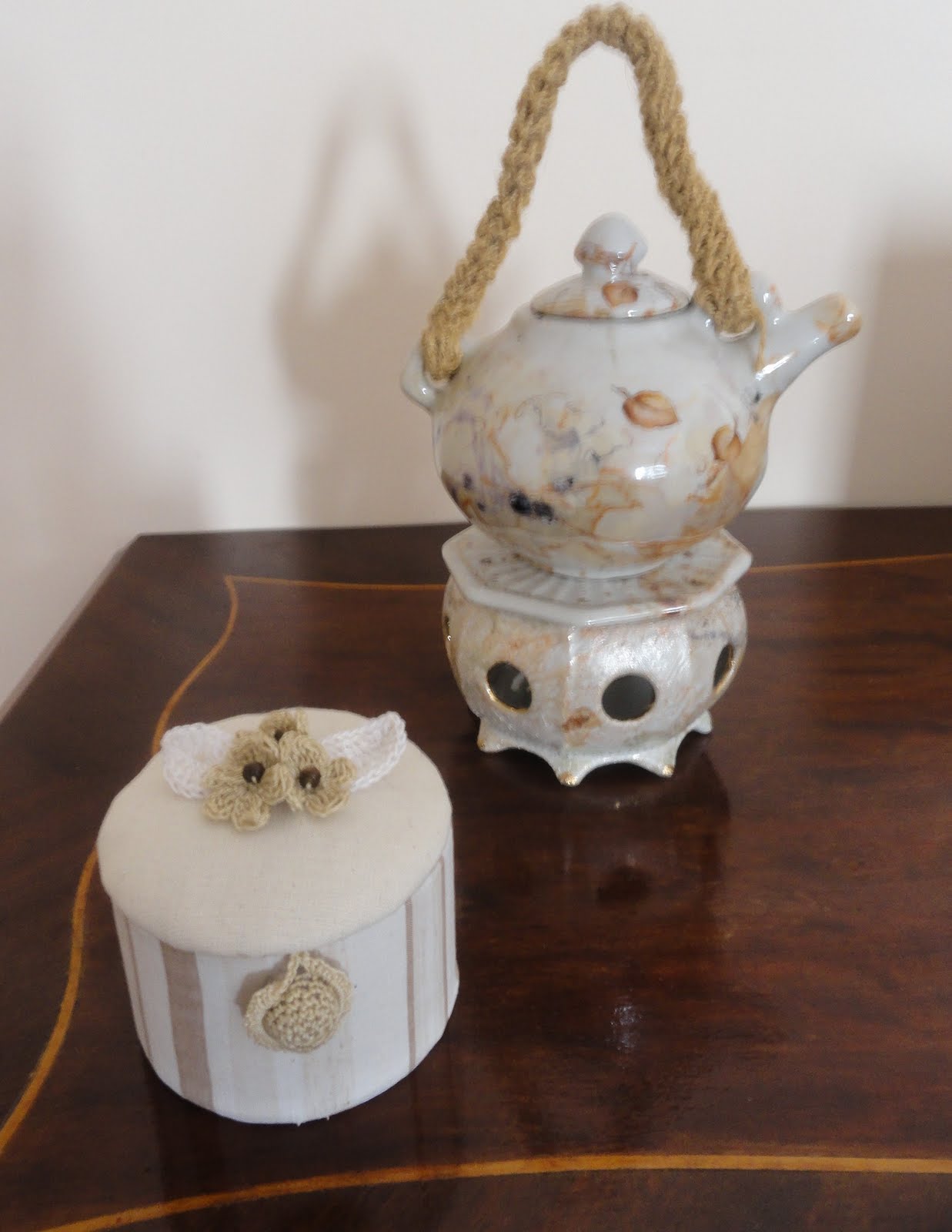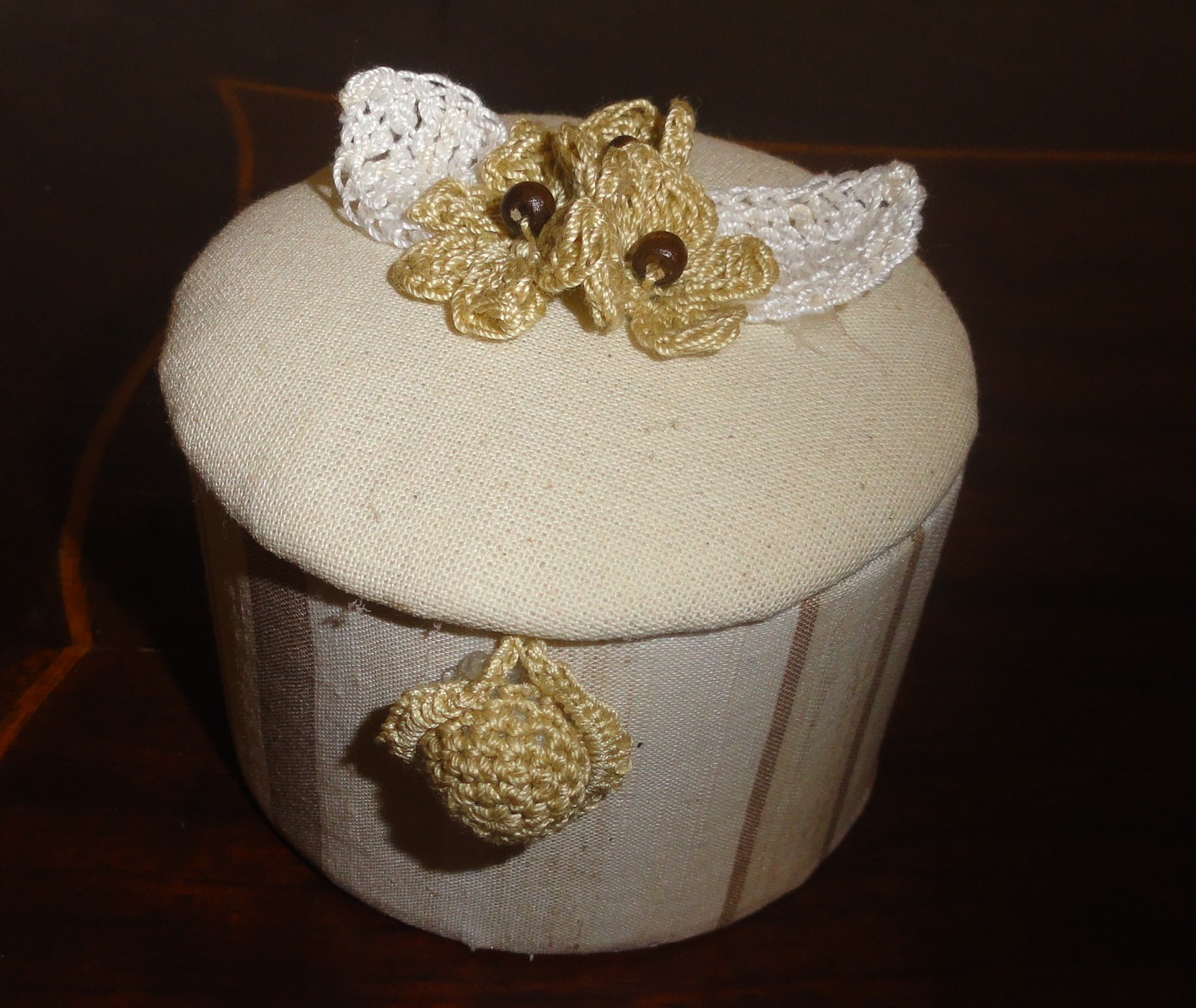 Con hilo Perlé (de DMC) hice las hojas , flores, el botón y la presilla para cerrar la caja.