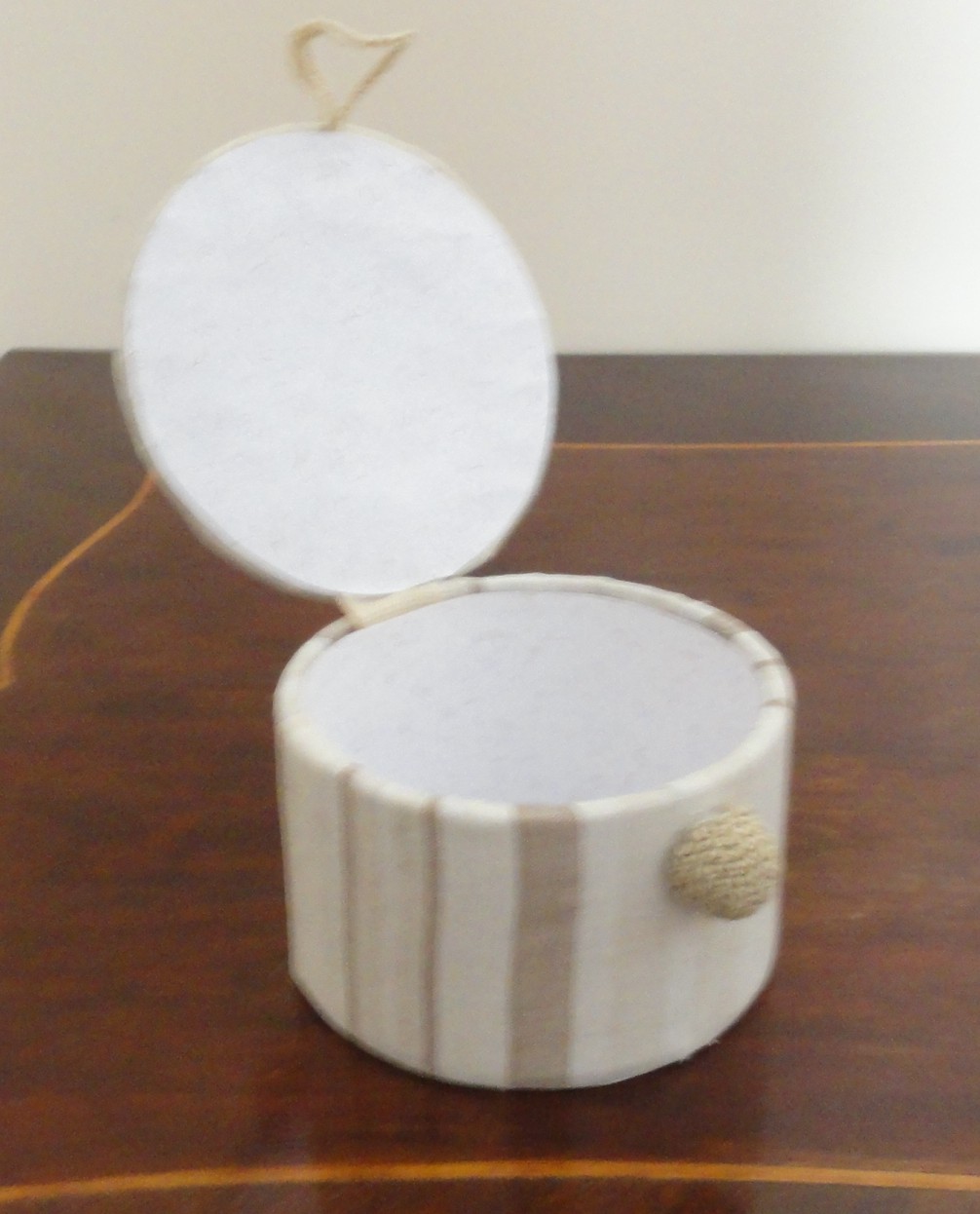 Forre la caja con tela y la parte superior de la caja. En la base, parte interior de la caja y tapa, usé un papel grueso, de esos que vienen en tamaño de cartulina y también en hojas A4 con distintos motivos y colores.