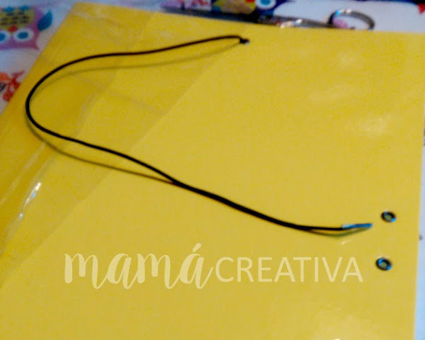 Cuando ya está forrada totalmente buscamos los agujeros de la carpeta y los abrimos en el forro y el papel ayudándonos de unas tijeras, para poder poner de nuevo la goma.