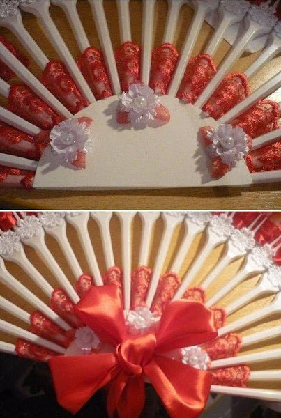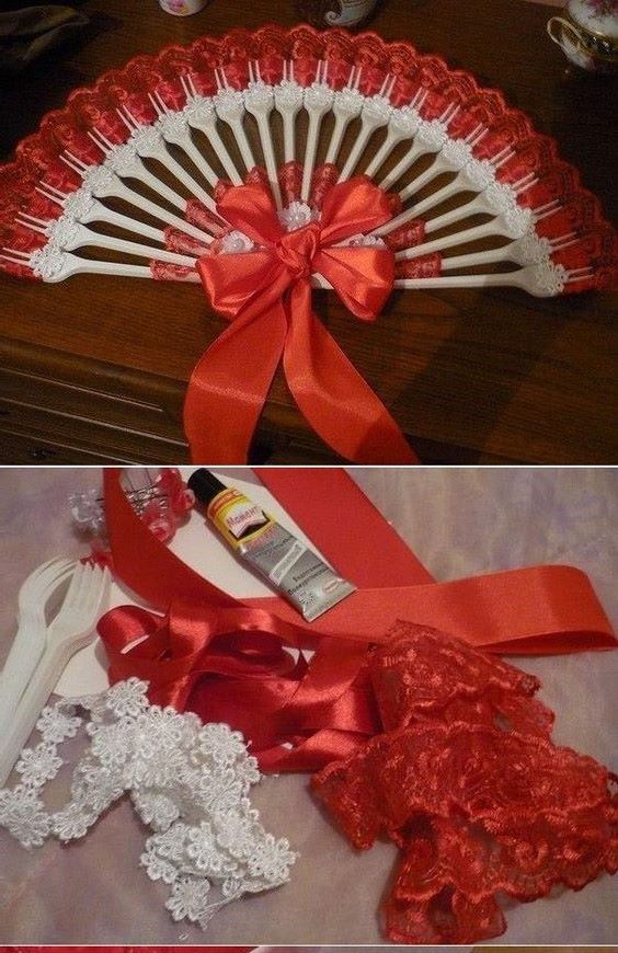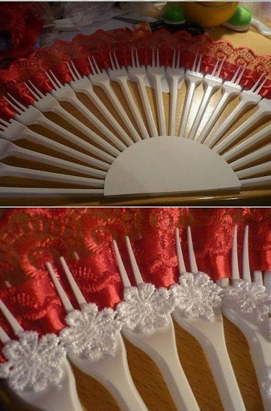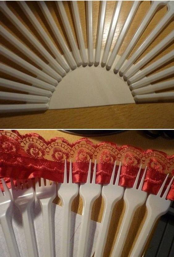 5.-Usa encaje rojo con listón para decorar el abanico, mete el encaje entre los dientes del tenedor, hazlo de manera consecutiva y ordenada pasando el listón entre cada uno de los tenedores de plástico.