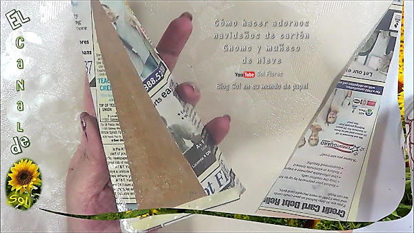 Probamos la estabilidad y funciona bien, luego con el pegamento espeso, poniendo muy poquito y bien repartido cubrimos la parte superior, y ponemos encima la hoja completa del directorio telefónico, cuidando que nos quede suficiente espacio por todos lados, con la bolsa de plástico sacamos todo el aire para que pegue bien, cortamos el excedente procurando que quede suficiente papel para dar la vuelta y pegamos, con el molde cortamos un triángulo y lo pegamos, pasamos nuevamente la bolsa de plástico por todos lados y dejamos secar para después pintar,