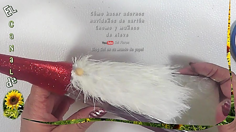 Para el gnomo yo pinté de plateado con pintura metálica en spray, medimos hasta donde llega el gorro, la pintura todavía está fresca, con silicón caliente pegamos la barba, y también el gorro, con spray para el pelo y un cepillo de dientes le acomodé la barba, en la goma eva cortamos un pequeño círculo y lo ponemos a calentar, yo estoy usando una plancha para el pelo, ya cuando se ha hecho bolita con silicón caliente pegamos la nariz,