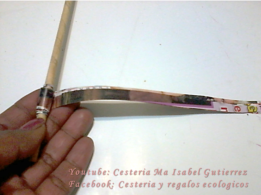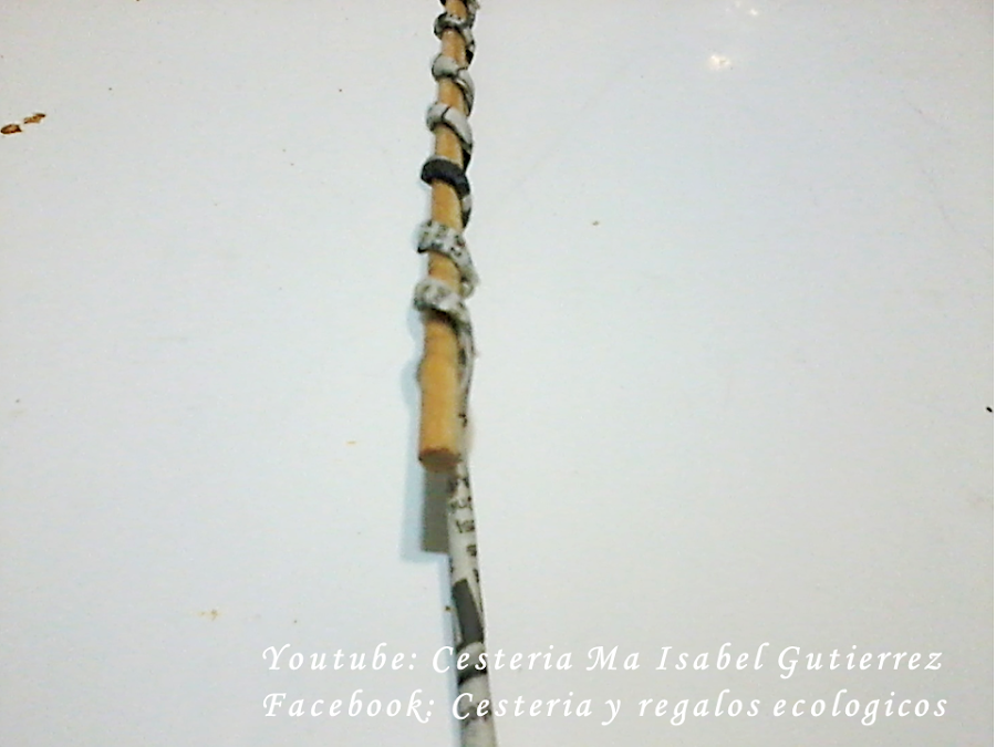 Ya que el almbre esta dentro de la varilla de papel, empezamos a enrollar sobre el tubo elegido, en este caso, estoy usando un palo de brocheta y el enrollado es apretado. Abajo, dejamos una parte lisa porque esa sera la que va encajada dentro del jarron...