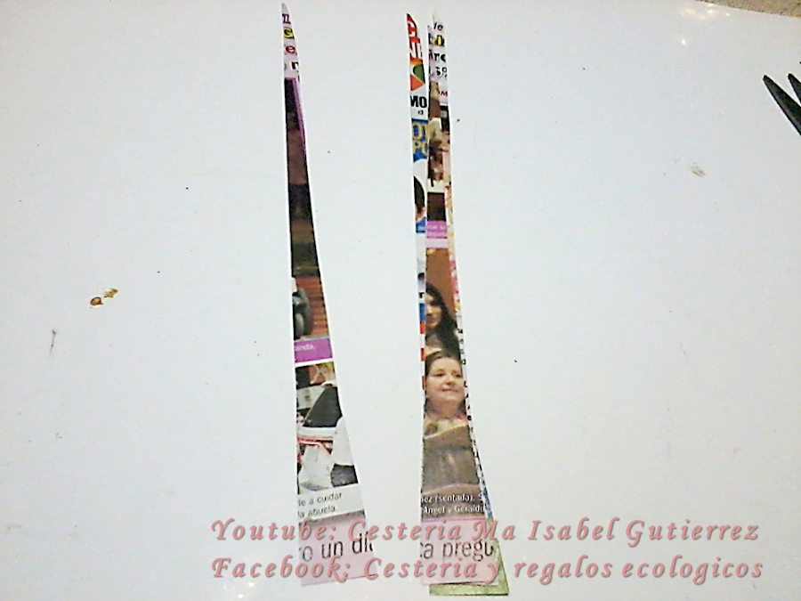 Ahora te muestro como hacer las cuentas de papel con las que adornamos algunas varas. Cortamos seis triangulos de papel muy largos, pueden ser de revistas, folletos o de diario, de base, tiene dos centimetros y de largo 27 centimetros aproximadamente....