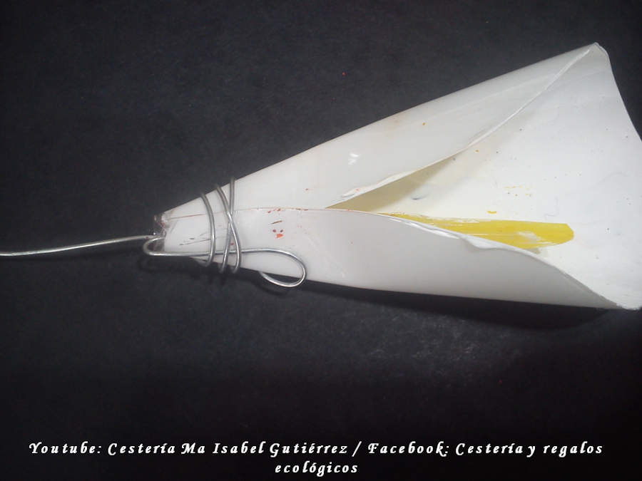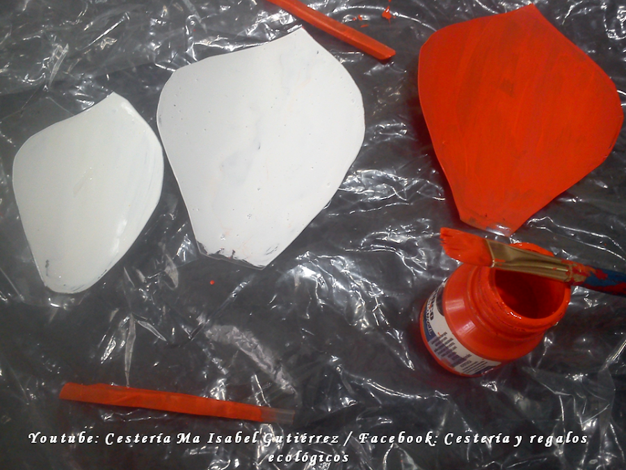 Pintamos con pintura acrílica, si es preciso, damos dos capas de pintura, también, del mismo plástico cortamos unos pequeños rectángulos, los cuales doblamos por los lados de manera que se forme como un tubo delgado, esta será la pieza que va al interior de los alcatraces...