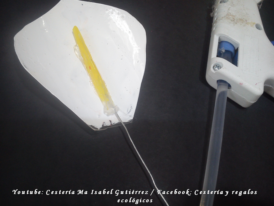 Insertamos un tramo de alambre delgado, en el tubito de plástico, poniendo silicón, luego, pegamos en medio de la flor como se ve en la imagen...