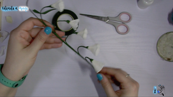 Colocamos en la base de la flor y el tallo tapé floral, vamos uniendo las flores una tras otra y cuándo ya están unidas acabamos de dar la forma de campana a cada flor.