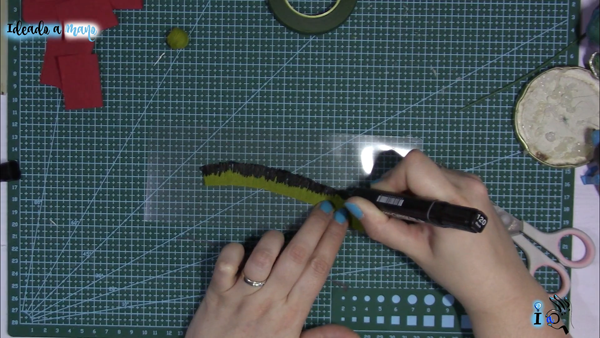 Luego, si tenéis papel crepé negro mejor, pero si no tenéis coged el mismo verde. Una tira como de 15-2cm x 15-16cm y se le hacen cortes paralelos al lado corto. Y se pintan las puntas cortadas de negro. Mientras el rotulador se seca se pega la bola a un alambre que sea bastante recio y luego se pega la tira de papel con las puntas negras alrededor de la bola.
