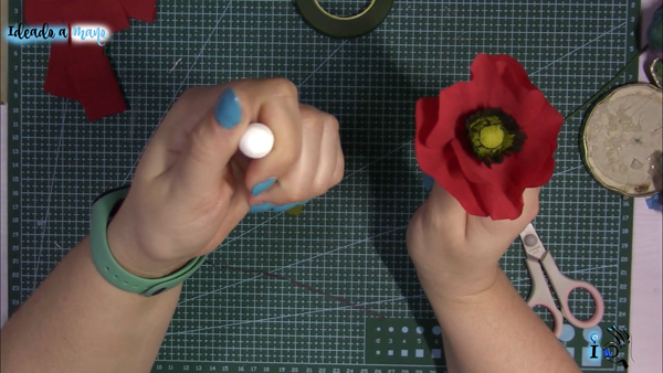 Se desdobla el pétalo y se da forma y estira, sobre todo por la parte superior, y se pegan por la inferior al tallo. Una amapola tendrá por lo menos 4 pétalos, pero hay algunas variedades que tienen bastantes pétalos más, así que hacedlas con todos los pétalos que queráis.