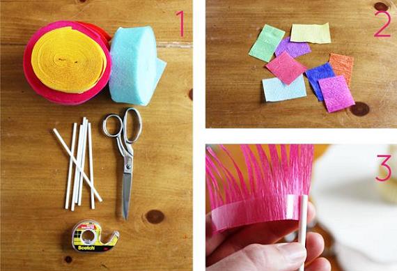 Cortamos flecos en los rectángulos, pasamos cinta adhesiva en la parte inferior y rodeamos un palito de madera con el papel crepe.