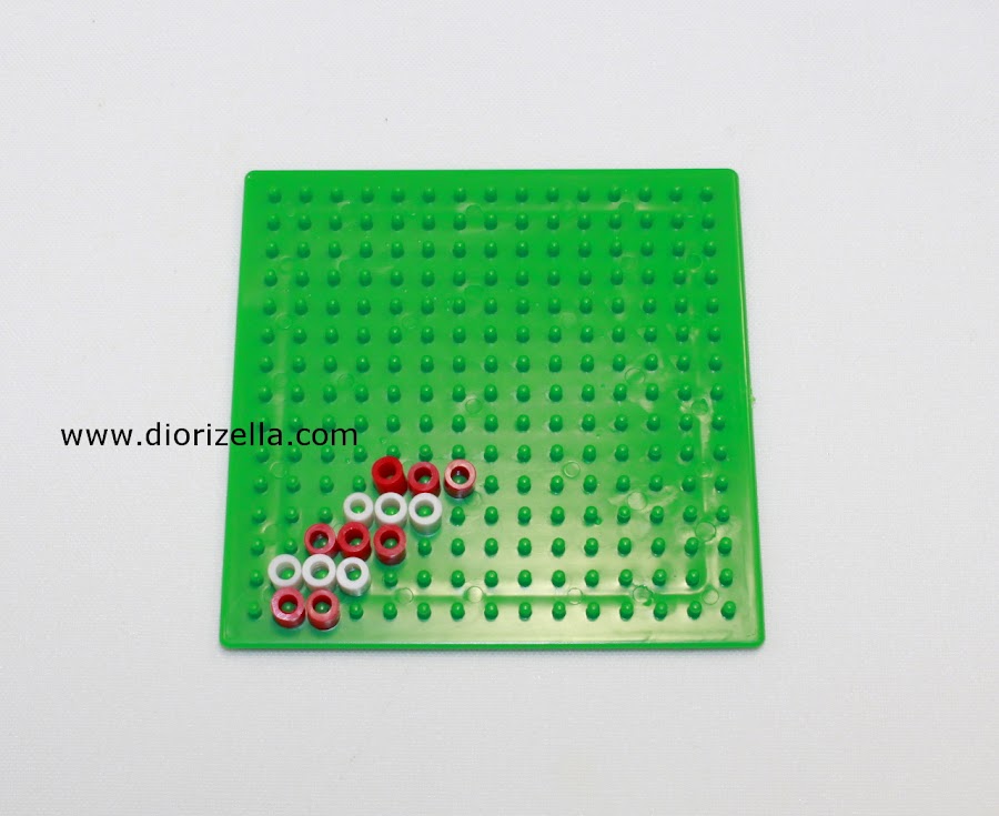 Lo primero que vas hacer es colocar un perler bead rojo en la segunda clavija de la primera linea del tablero. Luego coloca otra cuenta roja al lado de la primera. En la próxima linea vas a colocar 3 perler beads blancos y continúas colocando los perler beads de 3 en 3 alternando los colores y moviéndote una clavija hacia la derecha hasta completar 10 lineas.