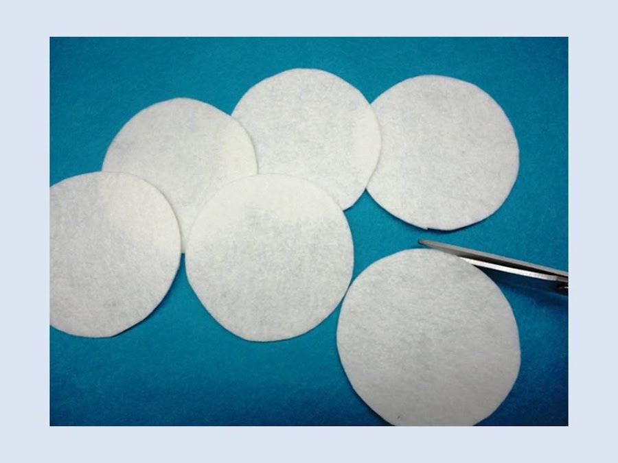 Marcar y cortar 6 círculos de fieltro del color que elijáis y del tamaño que necesitéis. Las mías las he hecho de 7 cm. de diámetro.