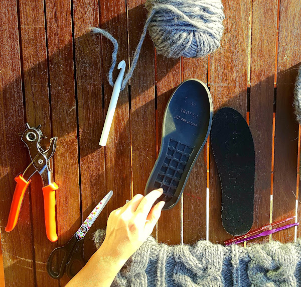 Para hacer una botas todas de ganchillo primero tienes que perforar las suelas, para poder pasar la lana.