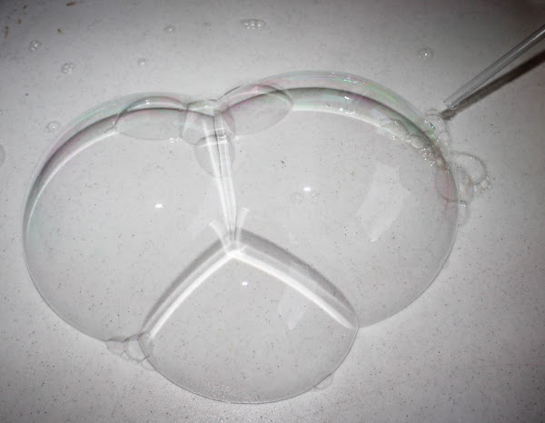Moja la mesa con este líquido y con el popote o pajita, sopla para hacer burbujas gigantes. Incluso, puedes insertar el popote dentro de la burbuja para hacer crecer aún más las burbujas.