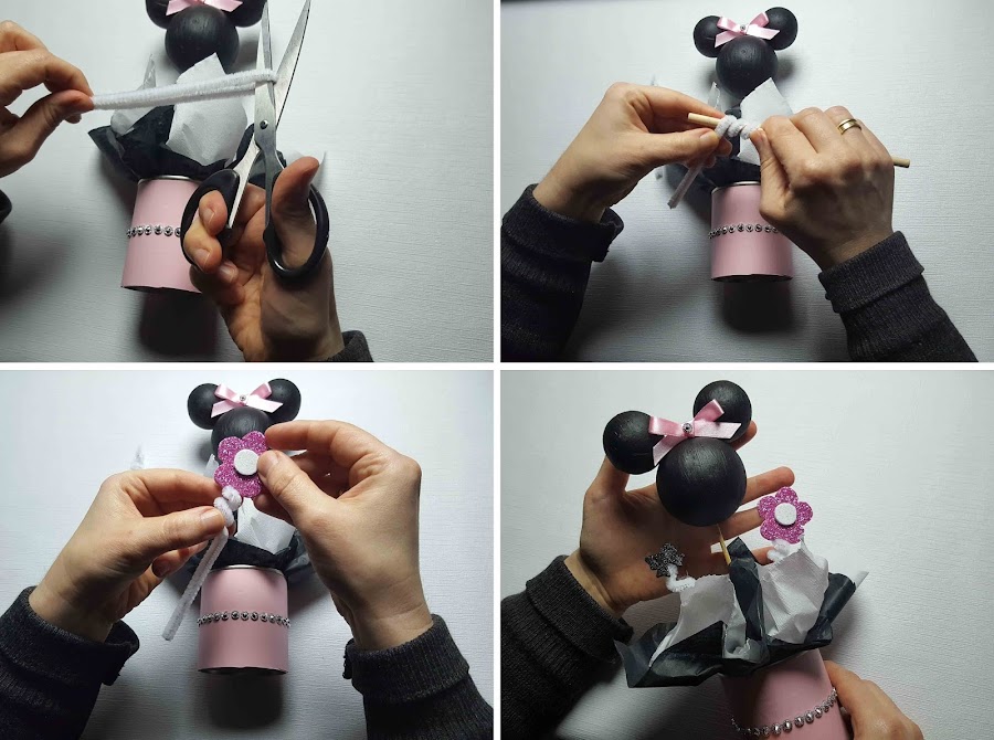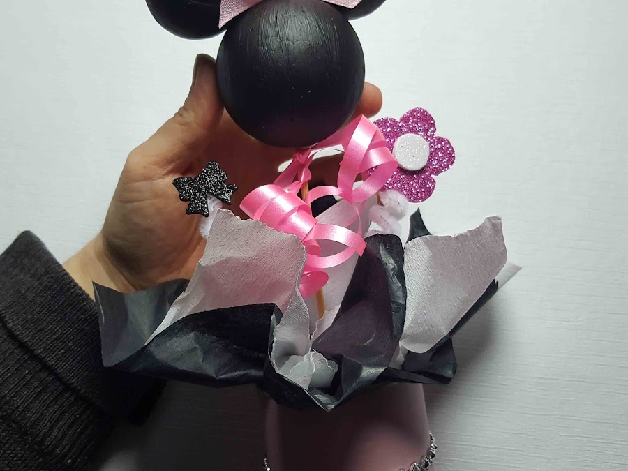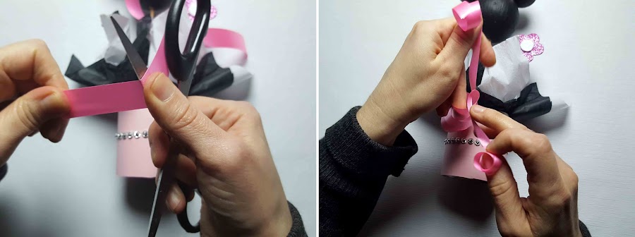 Ahora le damos el toque final con la cinta de regalo, la rizamos y la partimos en dos o tres partes. Por ultimo atamos las tiras con un nudo al palito de madera.