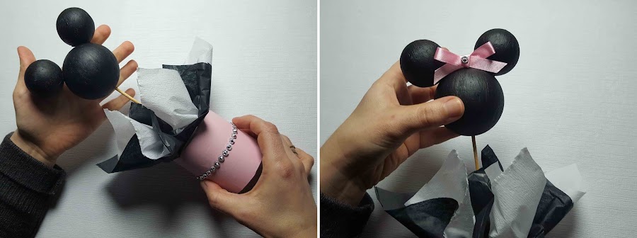 Aplicamos una gota de silicona en cada palito y clavamos las otras dos bolitas más pequeñas.