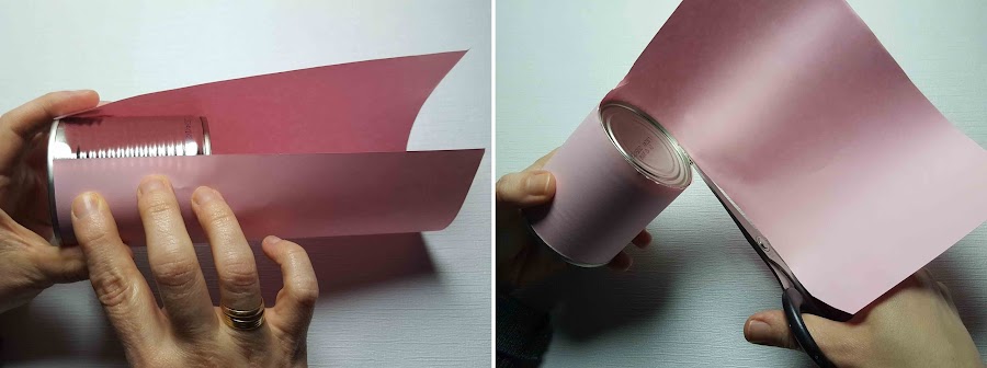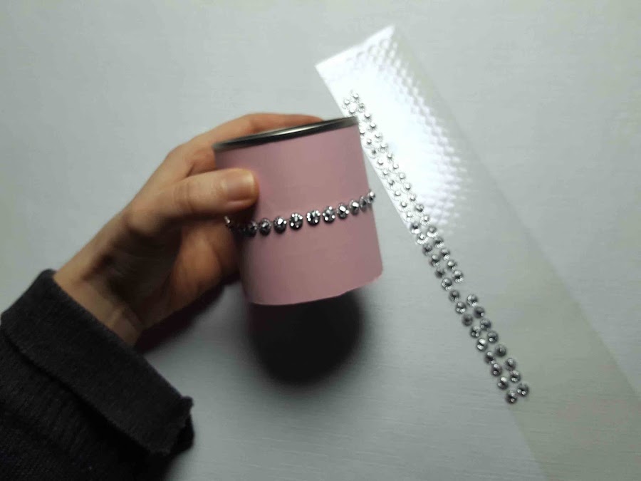 Empezaremos pegando el papel de color en la lata y recortando el papel sobrante. Pegamos una tira de strass adhesivo alrededor de la lata.