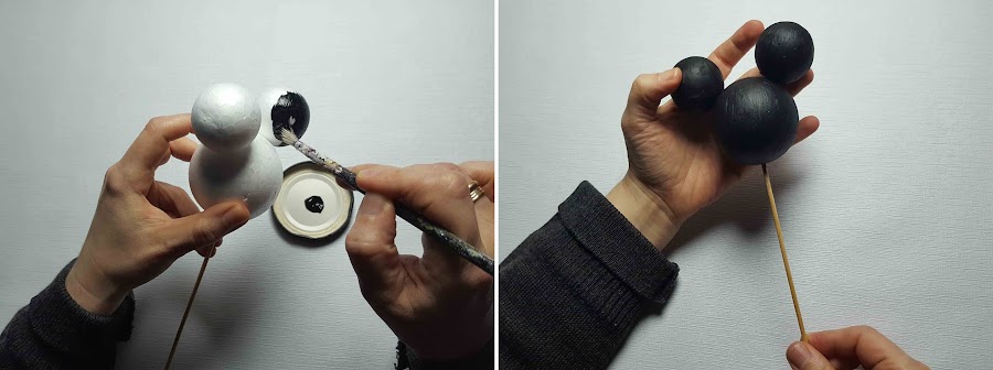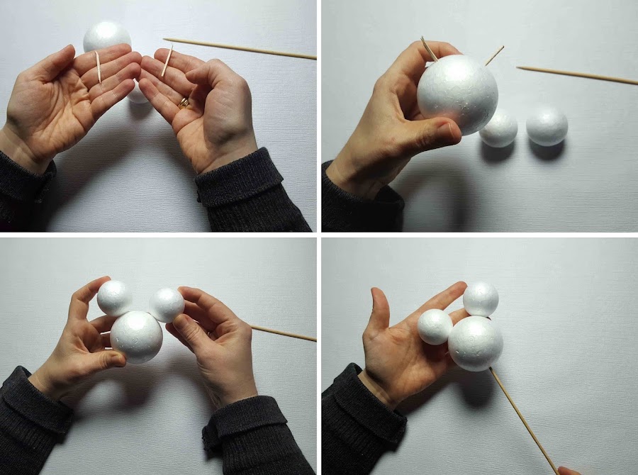 Partimos un palillo a la mitad y clavamos las dos partes en la bola de isopor más grande.