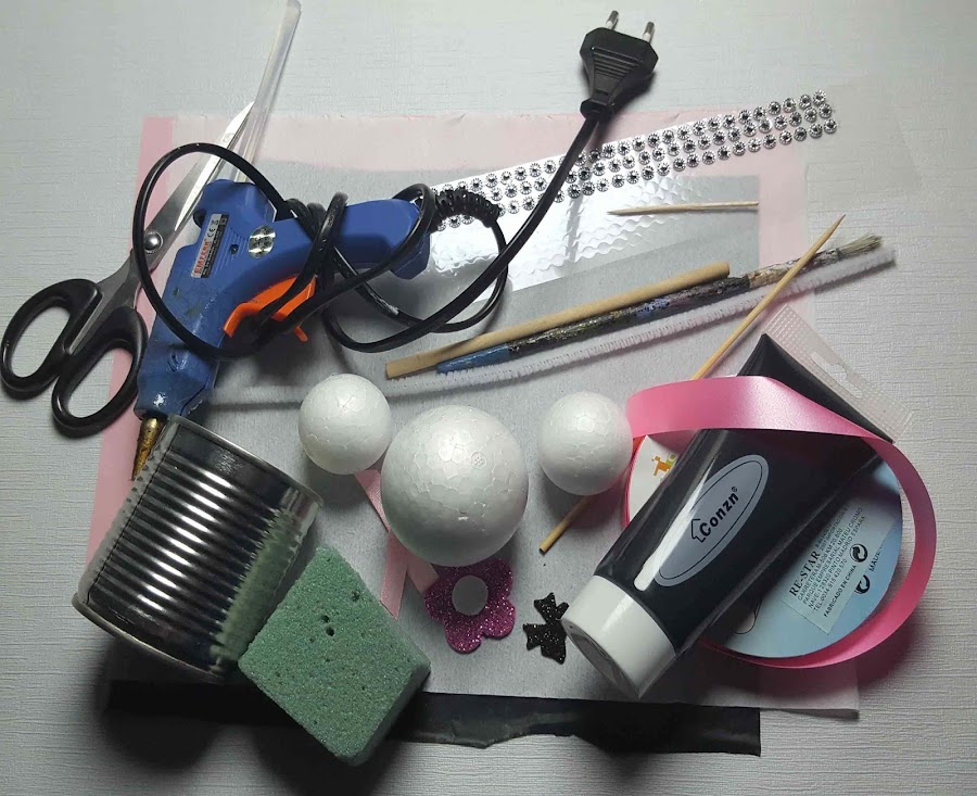 Una lata, tijeras, limpiapipas, pincel, lazo, strass adhesivo