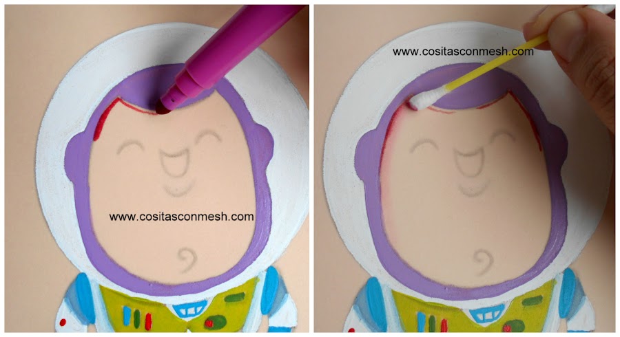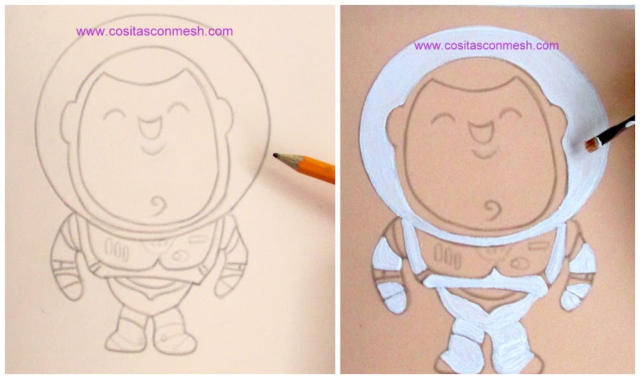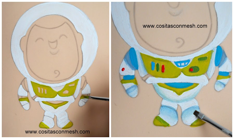3.-Con pincel de pelo suave y chato, pintamos de blanco parte del traje y el casco.