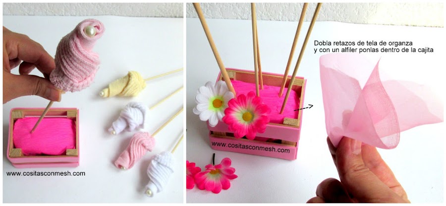 Para que no quede vacía la cajita, puse unas cuantas flores artificiales, por último, recorte rectángulos de tela de organza en color rosa, y con un alfiler los prendí dentro de la cajita, así quedara más bonita nuestro centro de mesa.