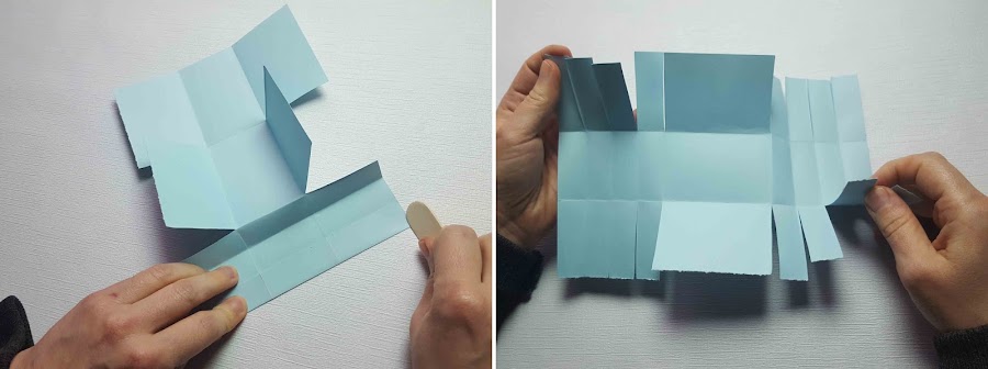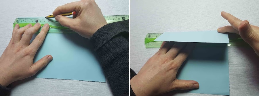 Marcamos en la cartulina unas medidas que os muestro en el vídeo. Una vez hechas las marcas doblamos con la ayuda de la regla y a continuación con la espátula.