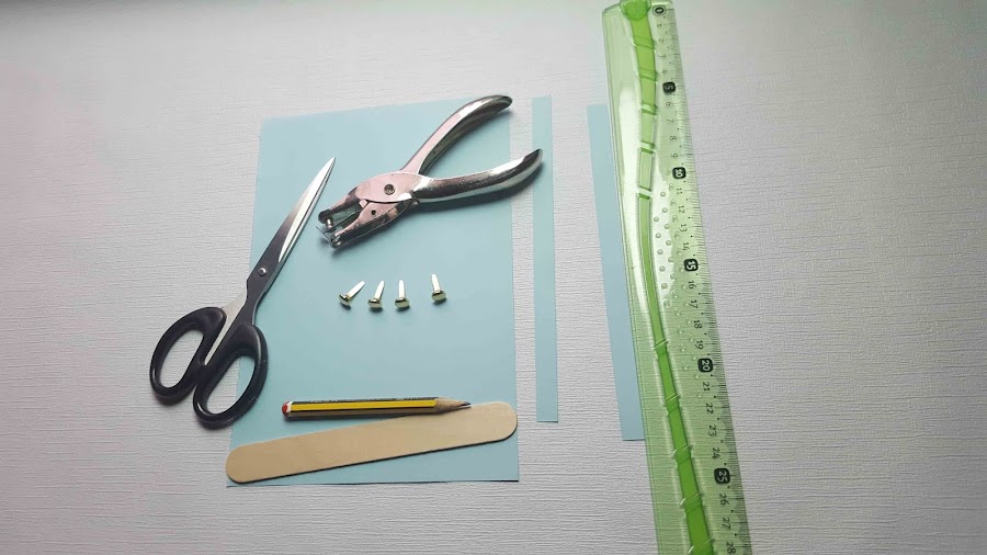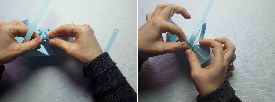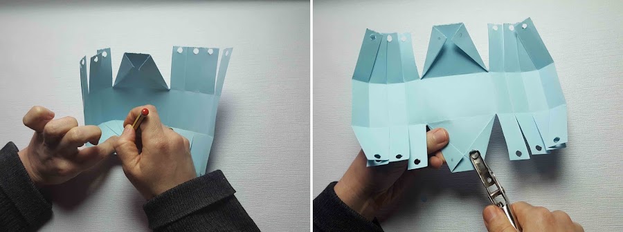 Hacemos dos dobleces a cada lado de los rectángulos y perforamos todas las tiras.