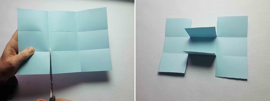 Hacemos tres dobleces a cada lado y cortamos en tiras por las marcas.
