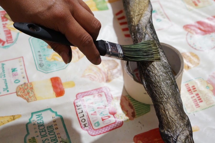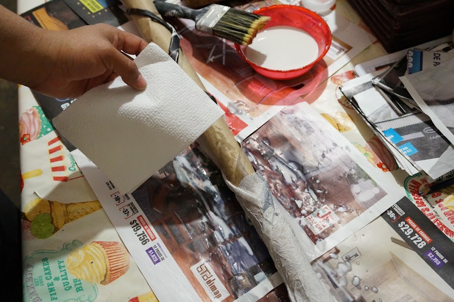 Ahora para darle firmeza, haremos una mezcla de resistol con agua 50/50 y utilizaremos servilletas para hacer una cartapesta, dejaremos secar.