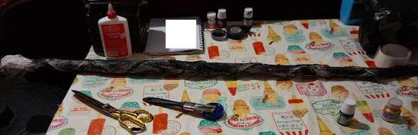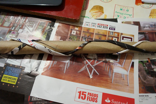 Empezaremos con el tubo de cartón, en el pondremos una bola hecha de periódico o revista, en un costado y pegaremos con cinta de carrocero. del otro lado del tubo de cartón, iremos colocando papel periódico como un tubo, hasta obtener el largo deseado y envuelve con el cartón delgado para dar firmeza. Ahora coloca tiras de papel periódico alrededor cruzados de manera que simule las víboras del cetro.