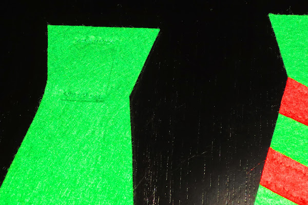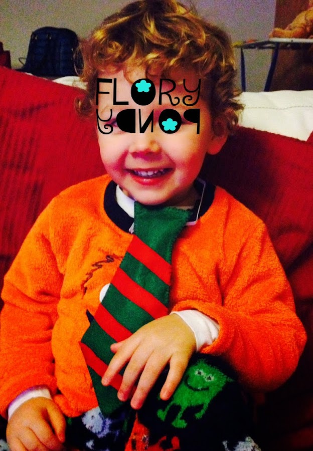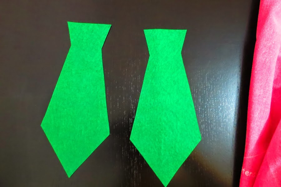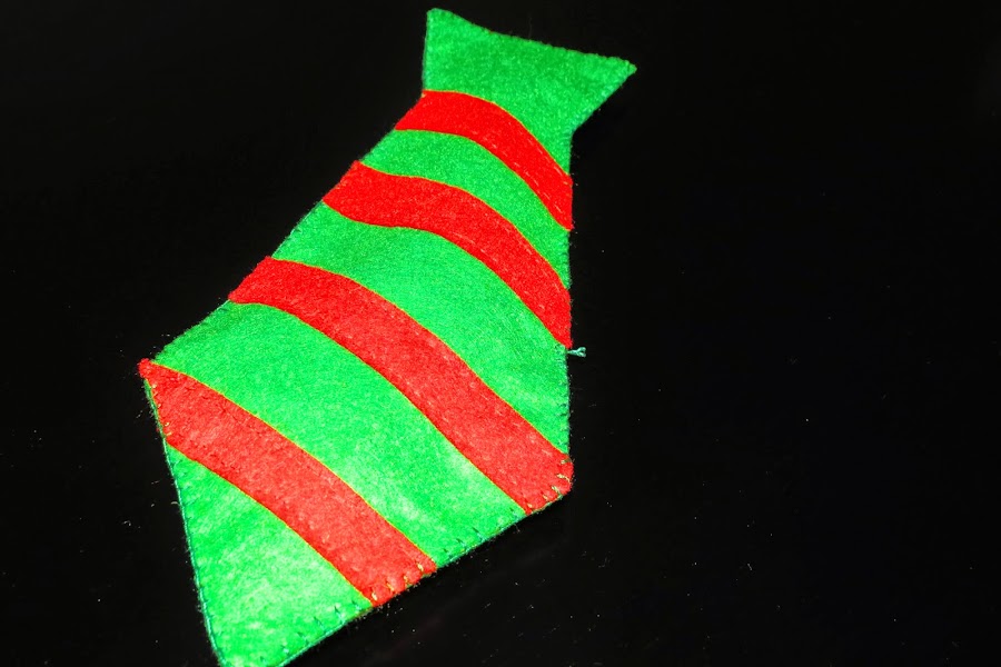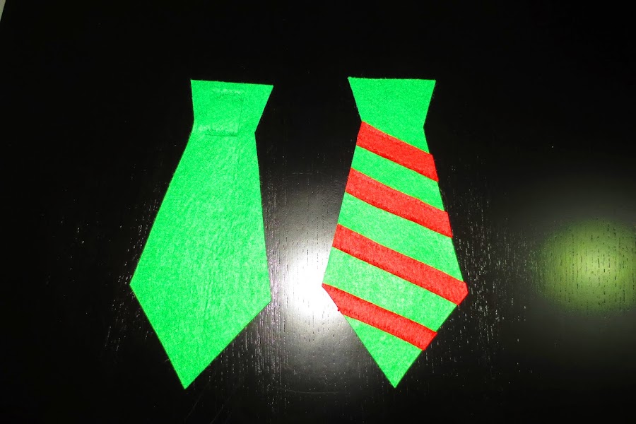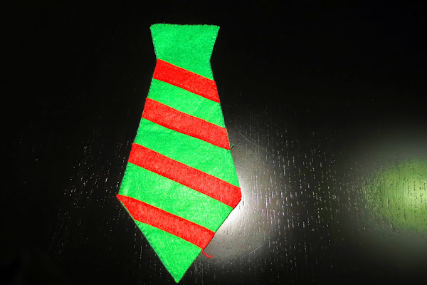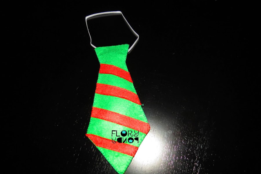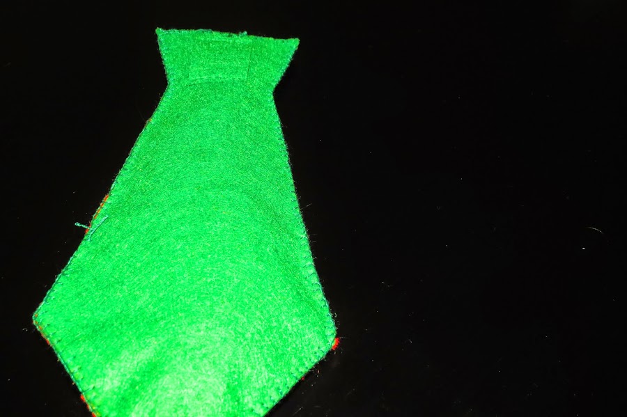 Y en la otra pieza de fieltro verde le coseremos una especie de trabilla para pasar luego la goma y que se pueda poner la corbata al cuello.