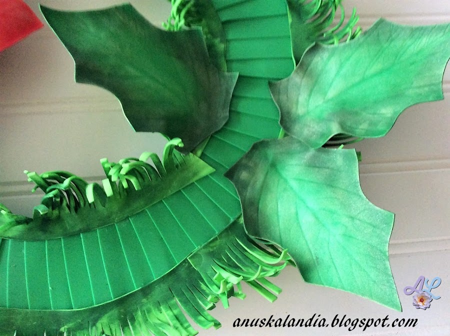 18. Con el resto de tiras que nos han sobrado, las cortamos en trozos que doblaremos a la mitad, pegaremos y colocaremos en el resto de la corona como falso "espumillón", más el resto de hojas y bolas.
