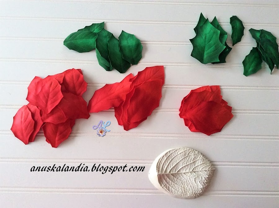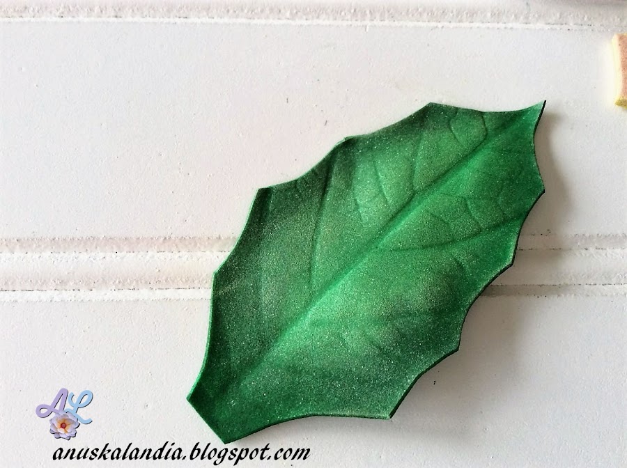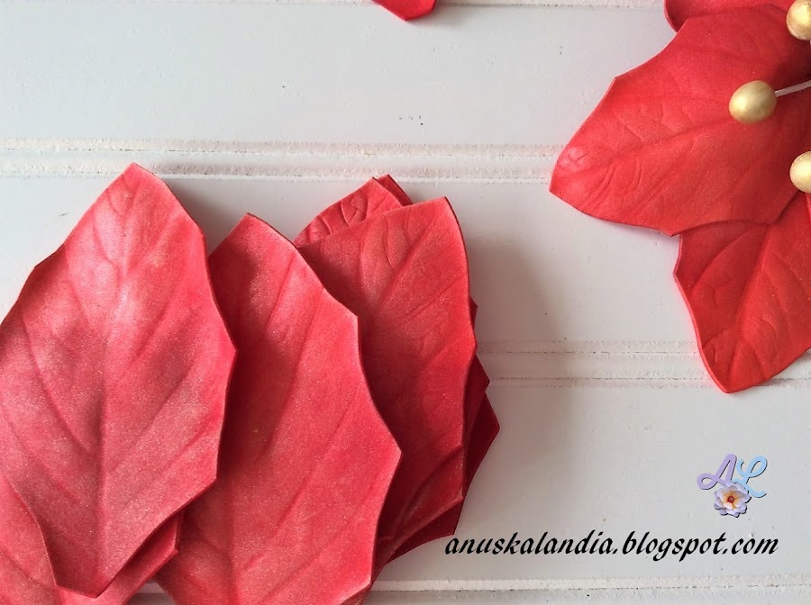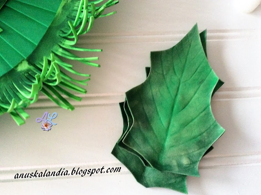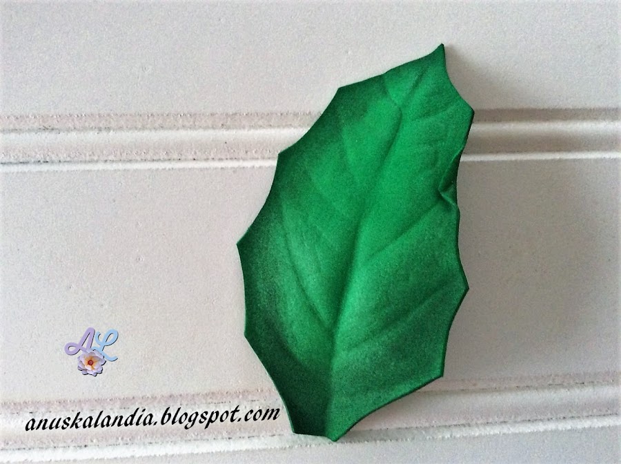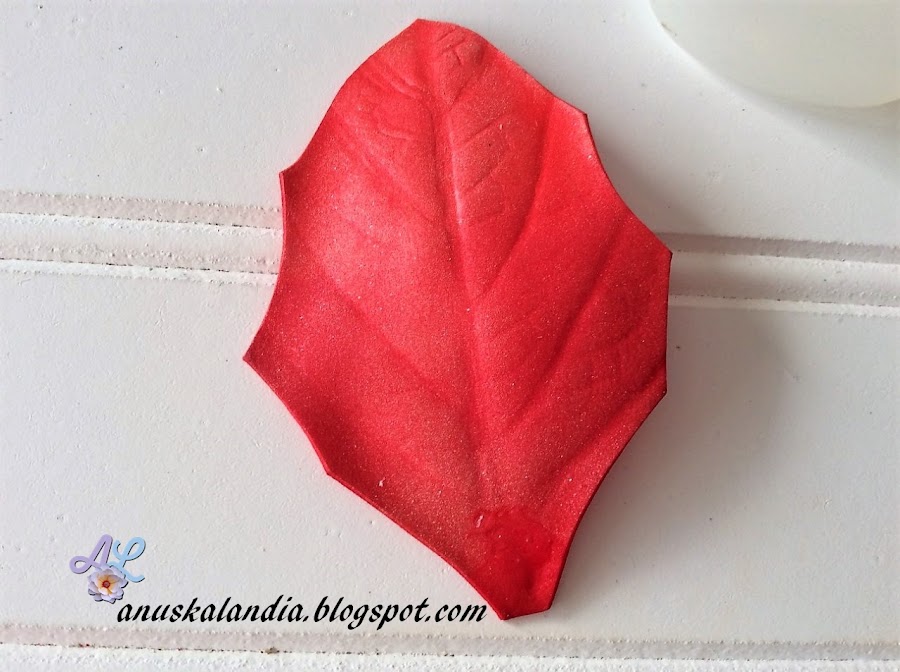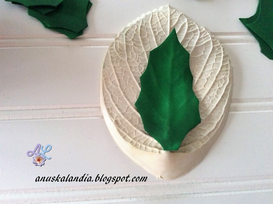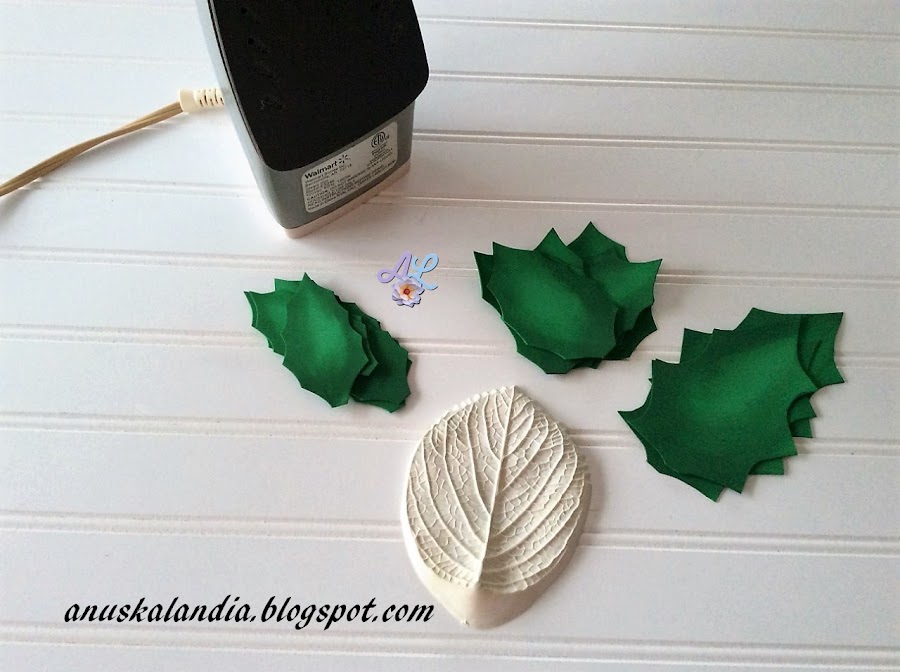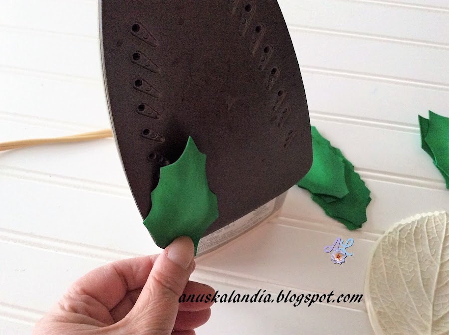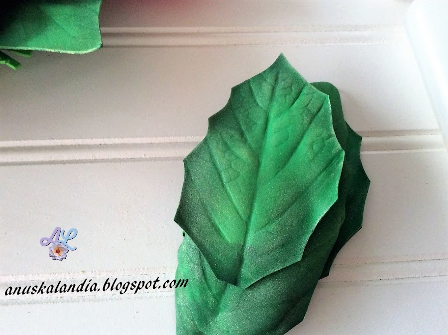 10.- El siguiente paso, es montar tanto las hojas como los pétalos, y además, que se marquen las nervaduras. Yo lo he hecho con un molde plástico, que compré por internet. (Si no lo tienes, puedes marcar las nervaduras con un palo de brocheta, y te saltarías este paso de calentar la goma eva).