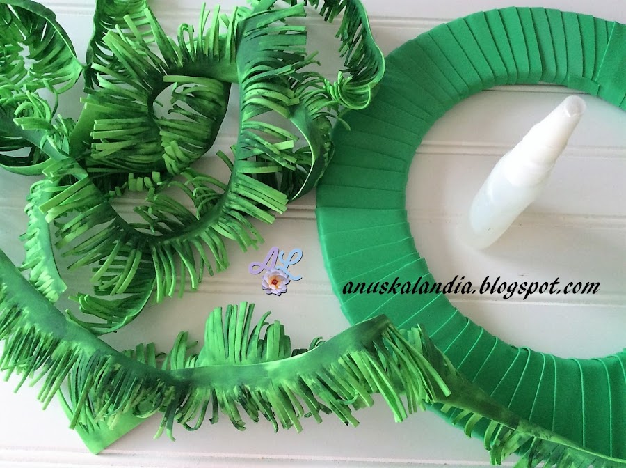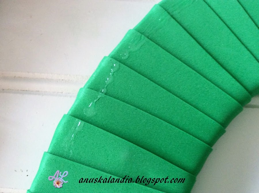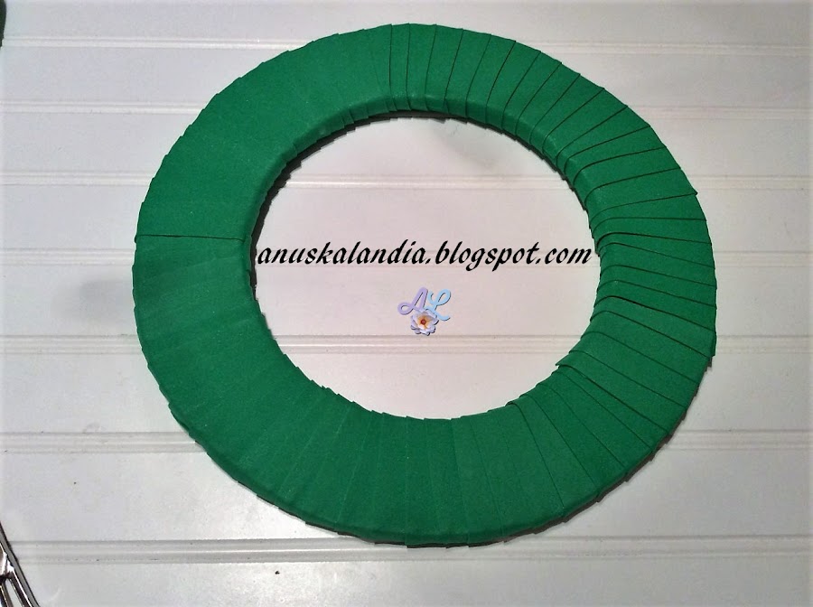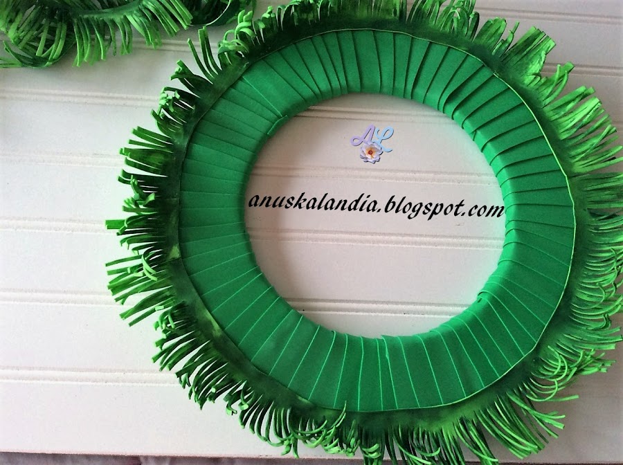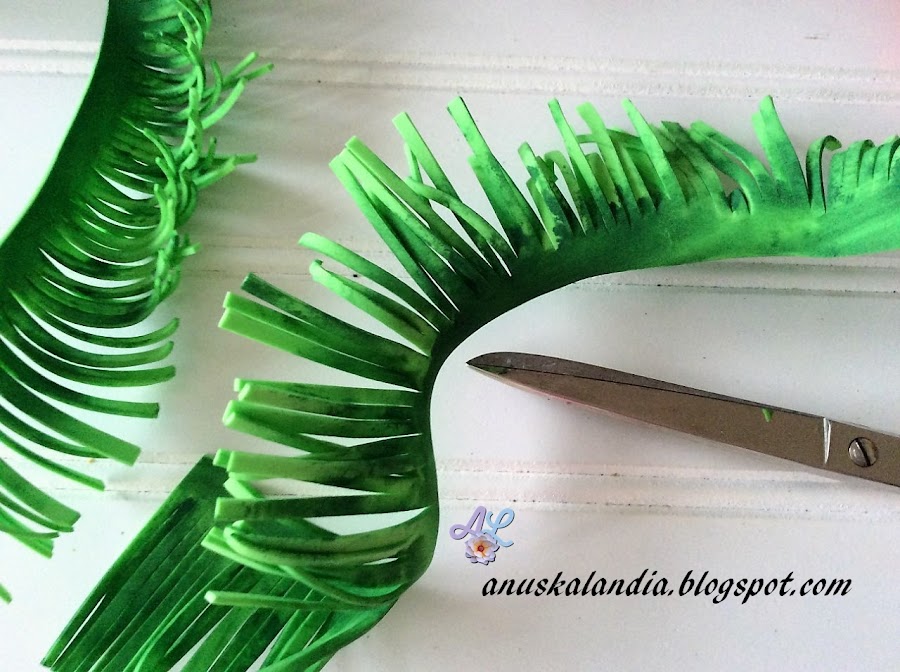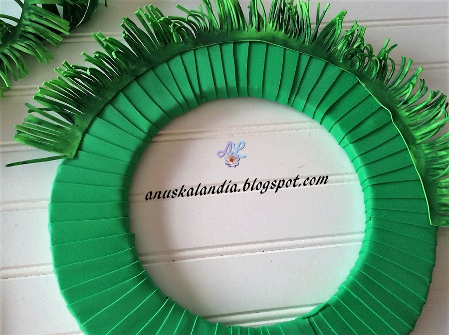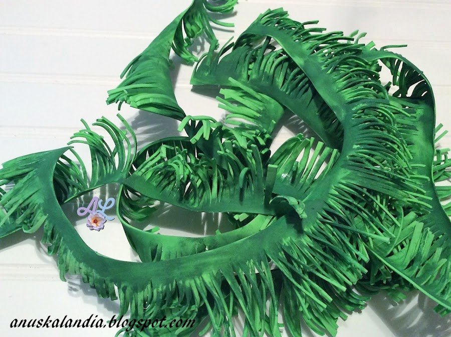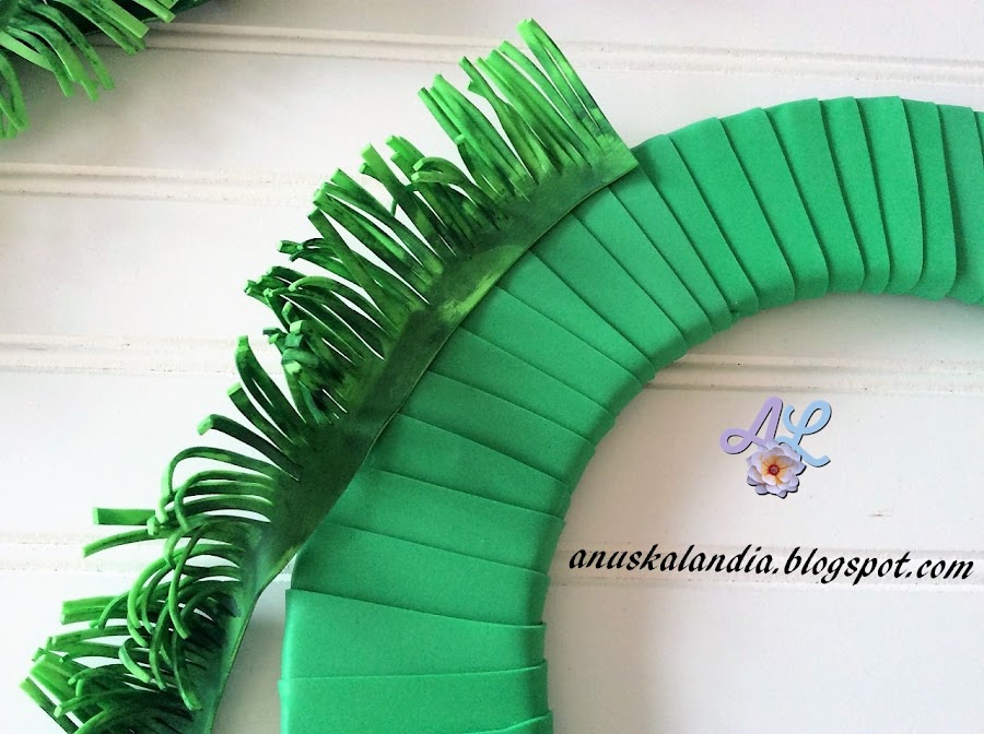 6.- Vamos a preparar el falso "espumillón". Cortaremos tiras de largo lo que tengas (igual que en las tiras para forrar la corona) y de ancho 5 cm. Posteriormente, vamos a dar cortes con tijera, a todas las tiras sin llegar al final. Se pintan con esponja con la pintura verde hoja. Se me olvidó hacer este paso aquí, y tuve que pintarlas cuando ya estaban moldeadas.
