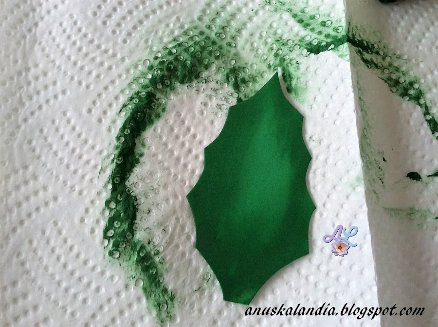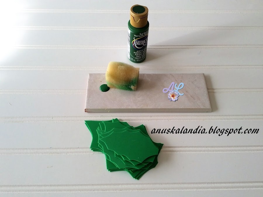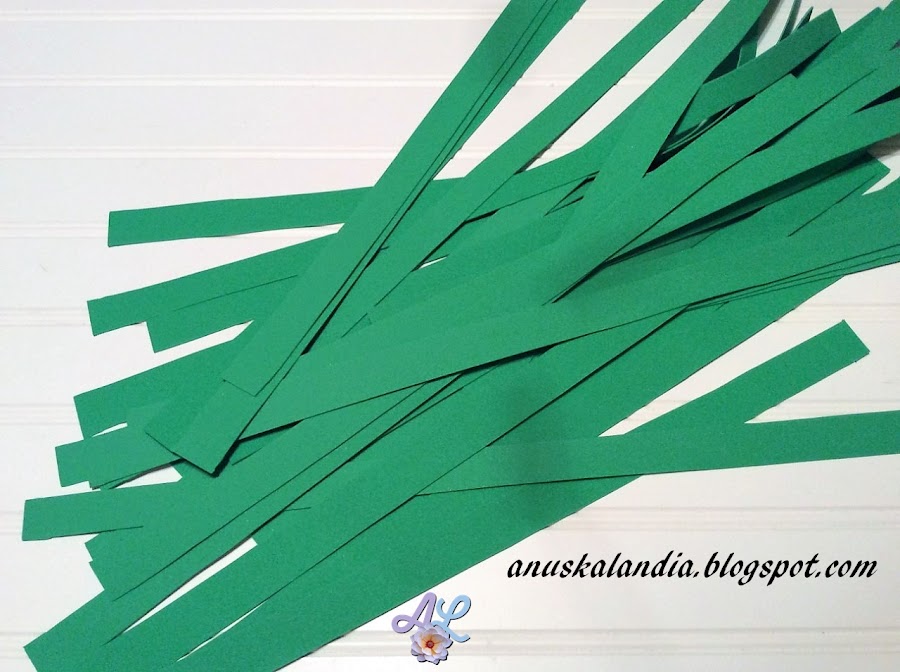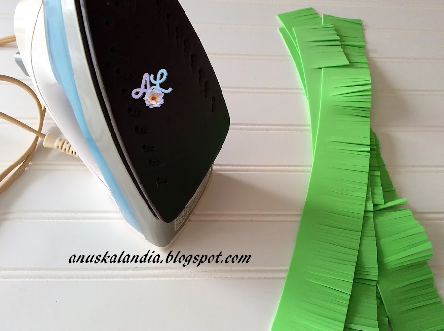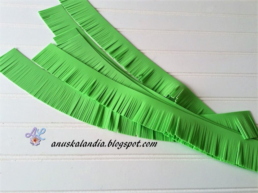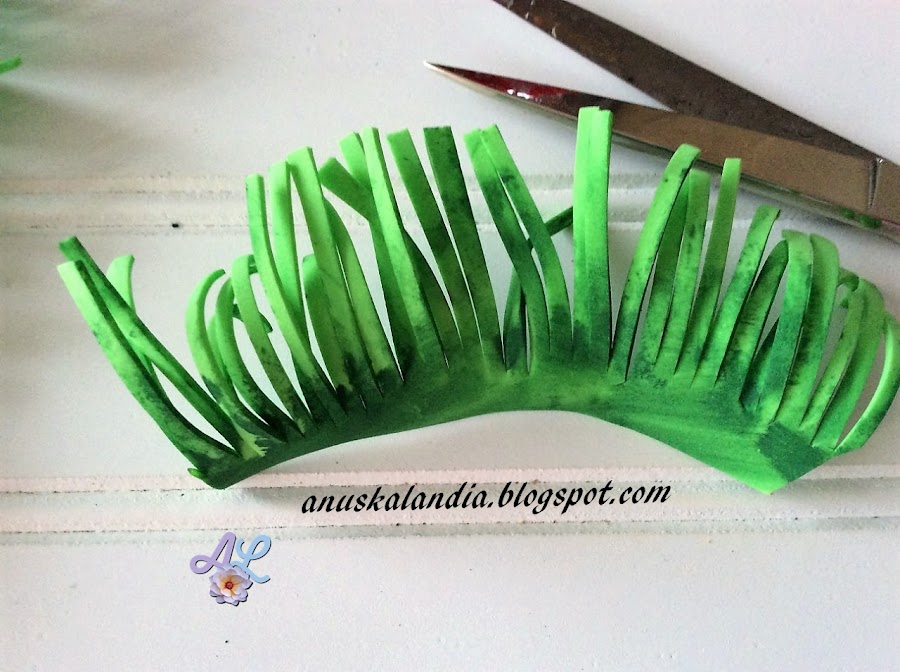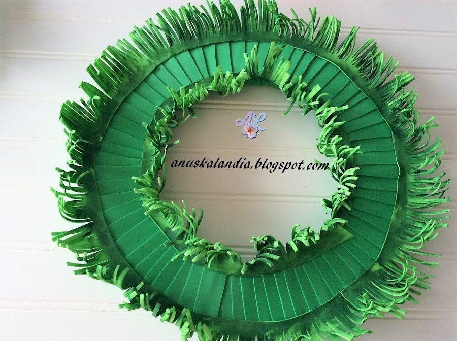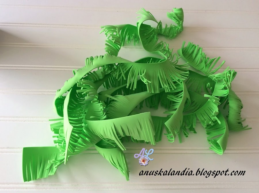 6.- Vamos a preparar el falso "espumillón". Cortaremos tiras de largo lo que tengas (igual que en las tiras para forrar la corona) y de ancho 5 cm. Posteriormente, vamos a dar cortes con tijera, a todas las tiras sin llegar al final. Se pintan con esponja con la pintura verde hoja. Se me olvidó hacer este paso aquí, y tuve que pintarlas cuando ya estaban moldeadas.