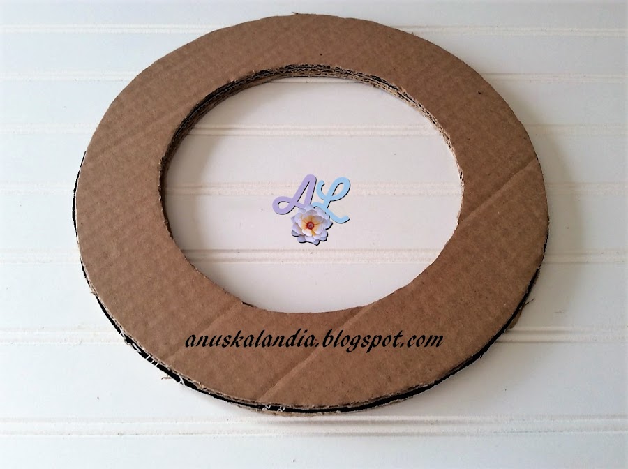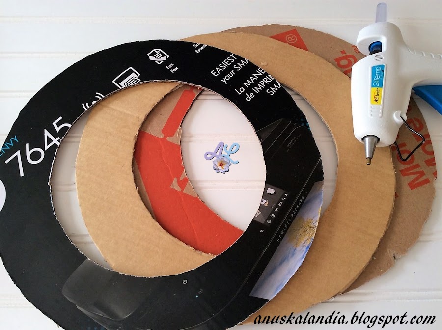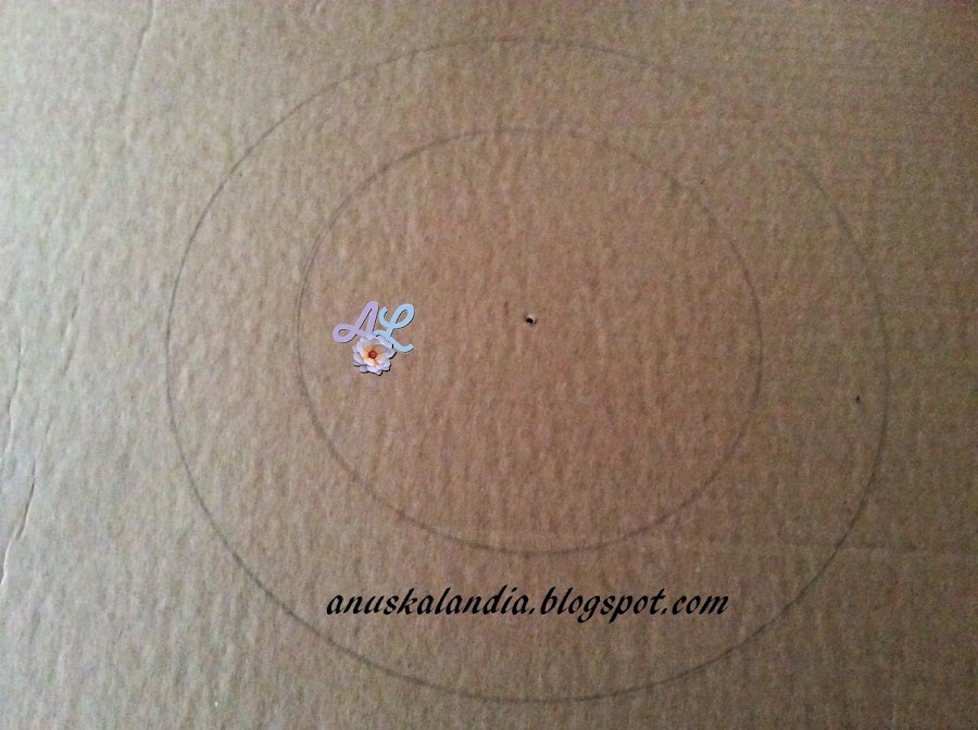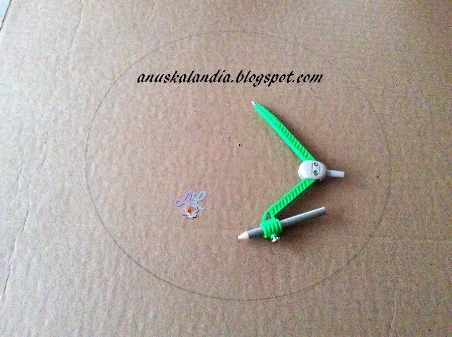 1.- Cogemos 3 trozos de cartón. En cada uno vamos a hacer 2 círculos, uno dentro del otro. El exterior, tendrá 30 cm. de circunferencia y el interior 5 cm. menos, o sea, 25 cm.