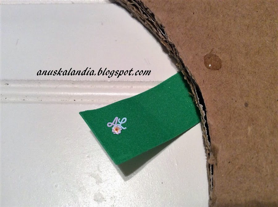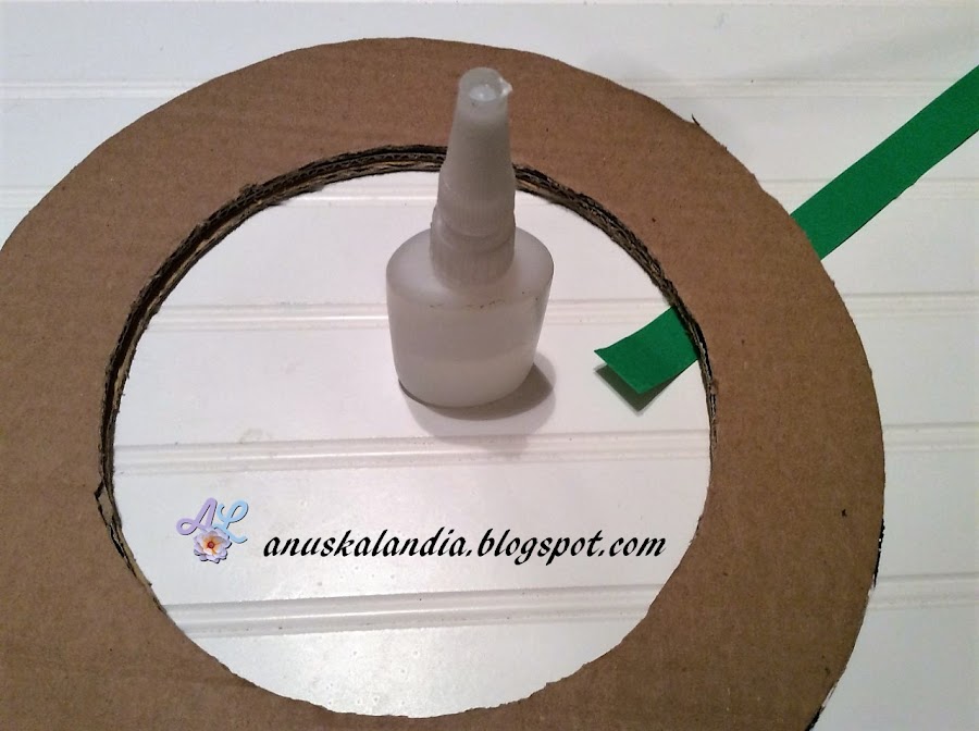 5.- Colocamos una gota de pegamento instantáneo en la parte posterior del cartón. Así haremos con todas las tiras (como en la foto), hasta tener forrada la corona completamente.