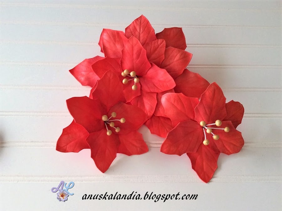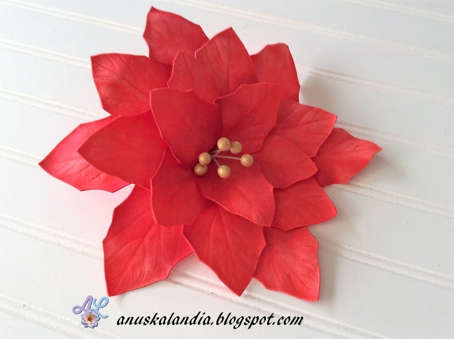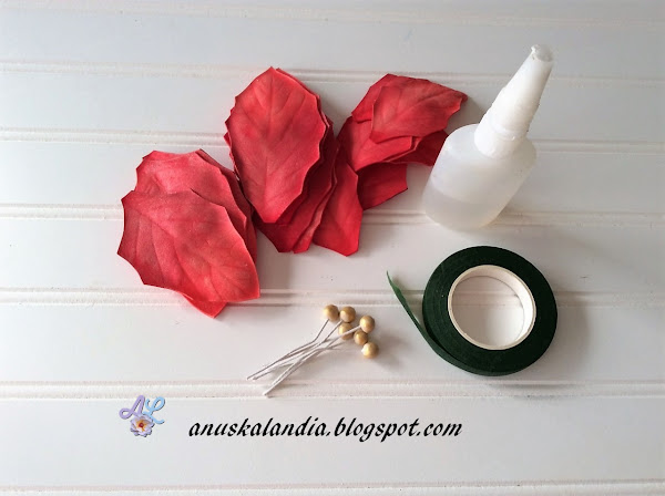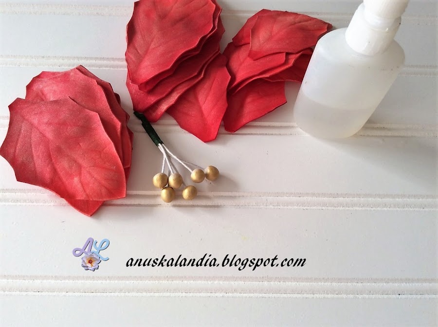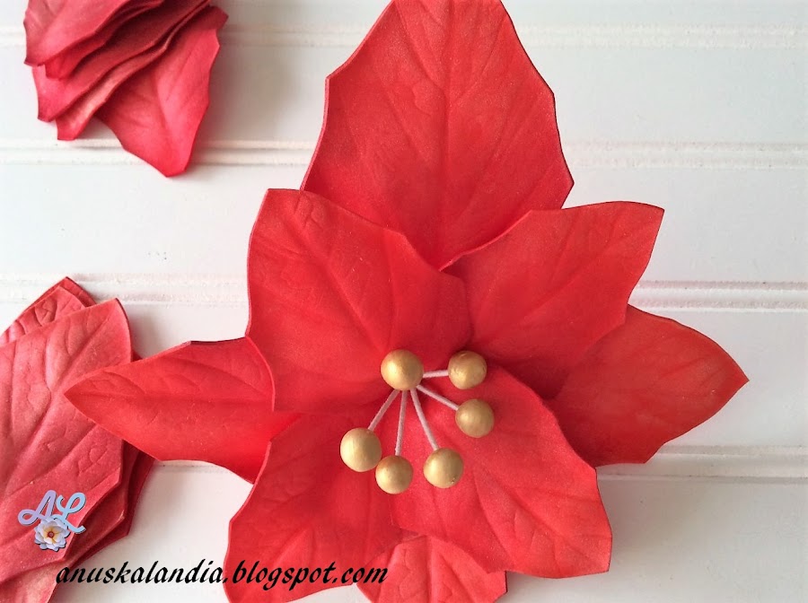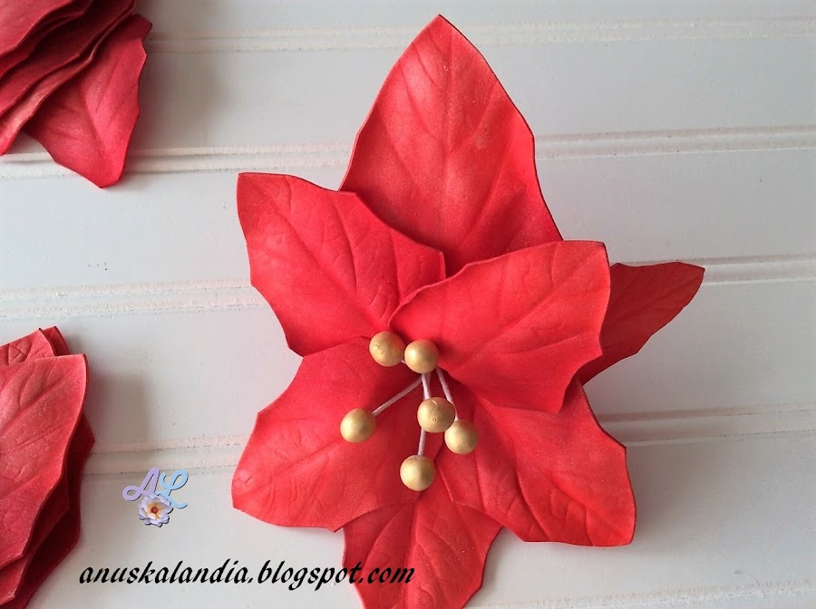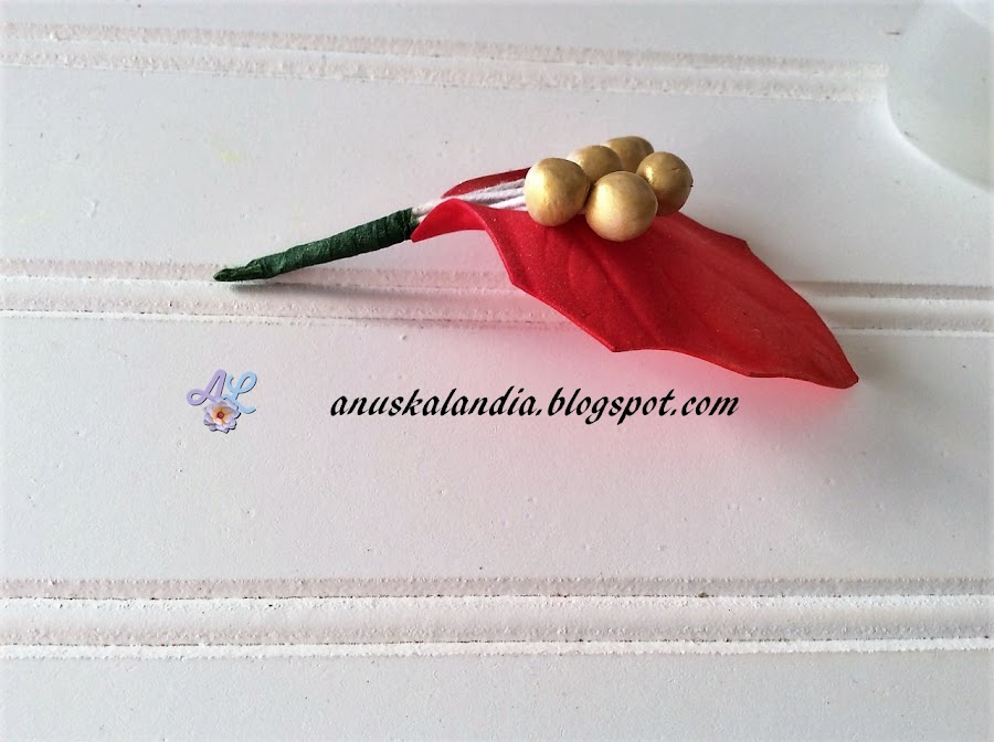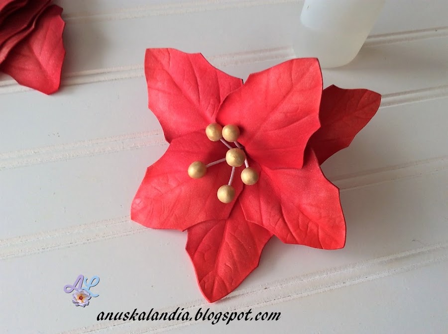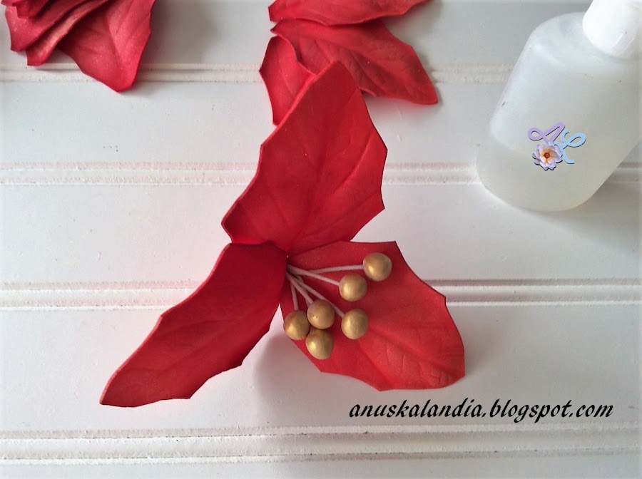 13.- Tomamos 6 pétalos pequeños. Cogemos uno y le ponemos pegamento instantáneo en la parte baja. Lo pegamos al grupo de 6 pistilos. Pegaremos otros dos pétalos (ver foto) y los otros tres restantes, en los huecos entre los pétalos anteriores. Hasta aquí, es cómo se harían las dos poinsettias pequeñas.