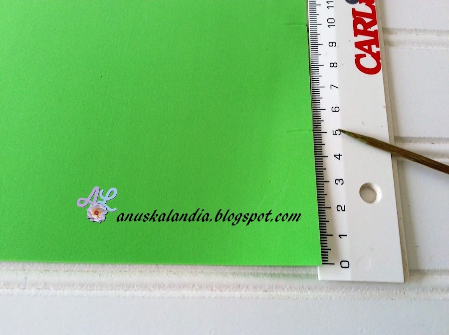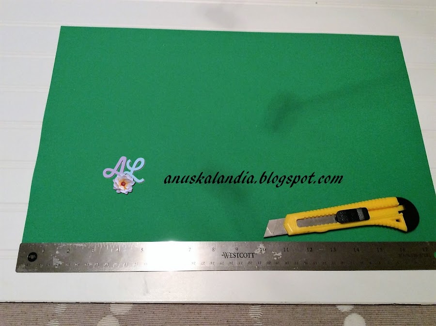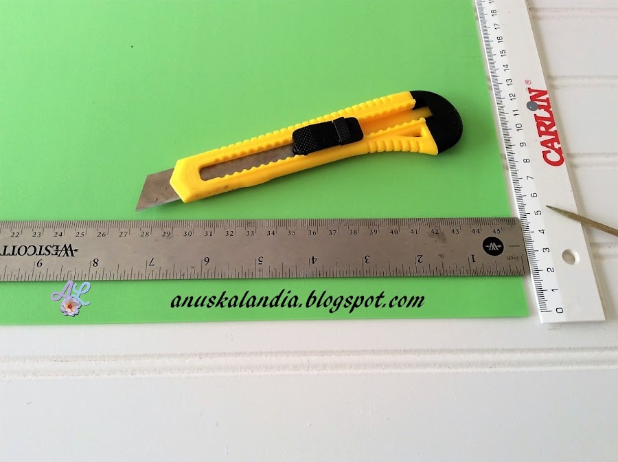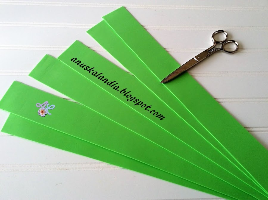 4.- Ahora procedemos a hacer tiras. En mi caso, de 46 cm. de largo por 2 cm. de ancho. Este tamaño (de largo) es así, porque aquí, las láminas de goma eva, la más grande es de 46 x 32. Si en tu país, venden goma eva, foamy, microporoso, etc., con un largo mayor, córtalas de lado a lado y con los 2 cm, de ancho igualmente. Para que te hagas una idea, he necesitado alrededor de 18 tiras.