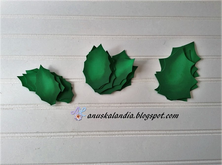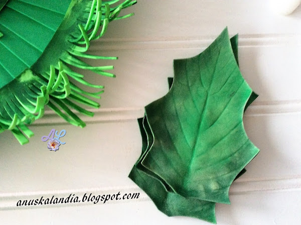 17.- Cogemos un par de hojas medianas, y las pegamos a la corona, por la parte superior e inferior de la corona, para así poder pegar igual que antes, las dos flores pequeñas.