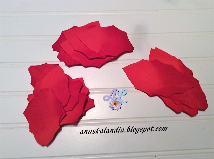 14.- Continuamos para hacer la grande. Se cogen los 6 pétalos medianos y hacemos los mismo que con las pequeñas, pegar los pétalos entre pétalos. Cuando terminemos con estos, haremos los mismo con los pétalos grandes. Así nos quedarían las tres flores.